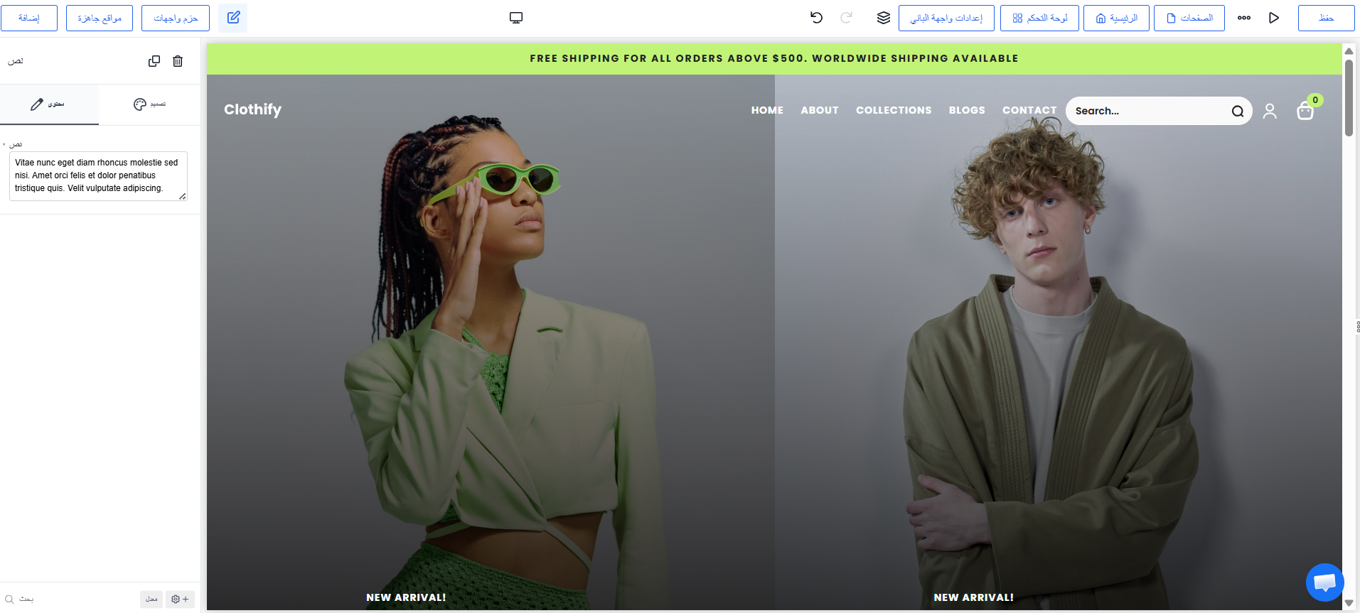 بتدخل على محرر السحب والإفلات مباشرة، تعدّل الألوان والصور والمنتجات زي ما تحب، وموقعك أصلاً أونلاين من أول لحظة.